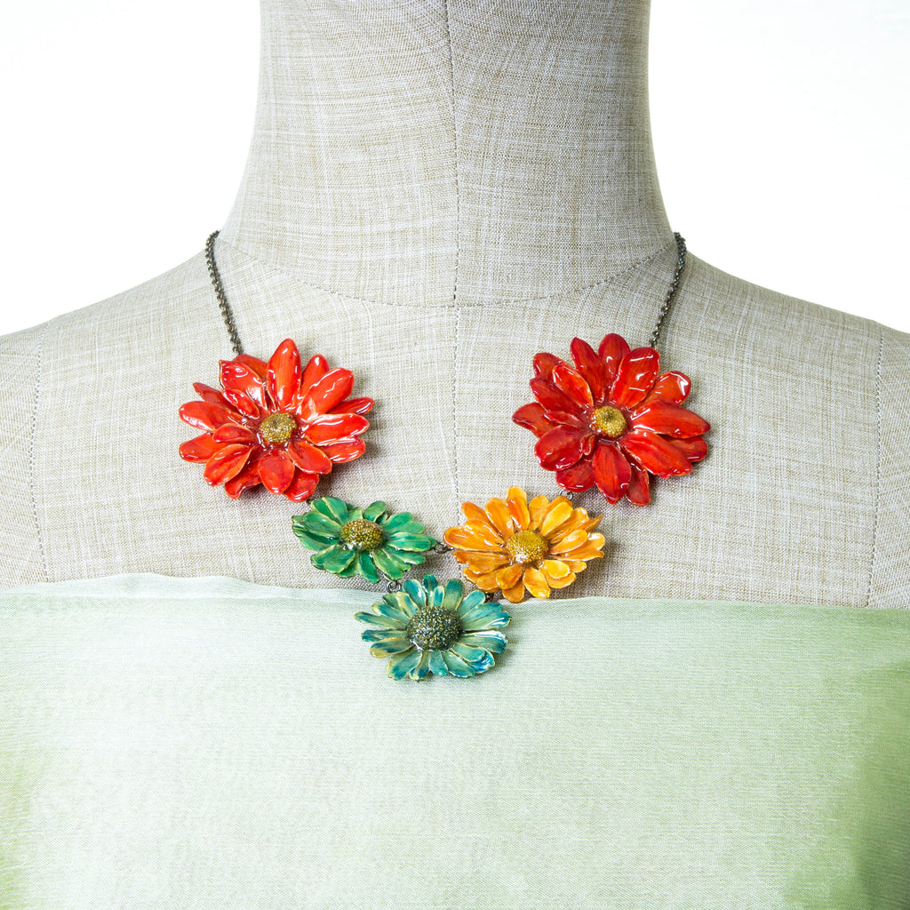 Part of our Tropical Garden collection, this statement necklace has been carefully crafted from real asters and daisies which have been hand dyed and coated in lacquer.