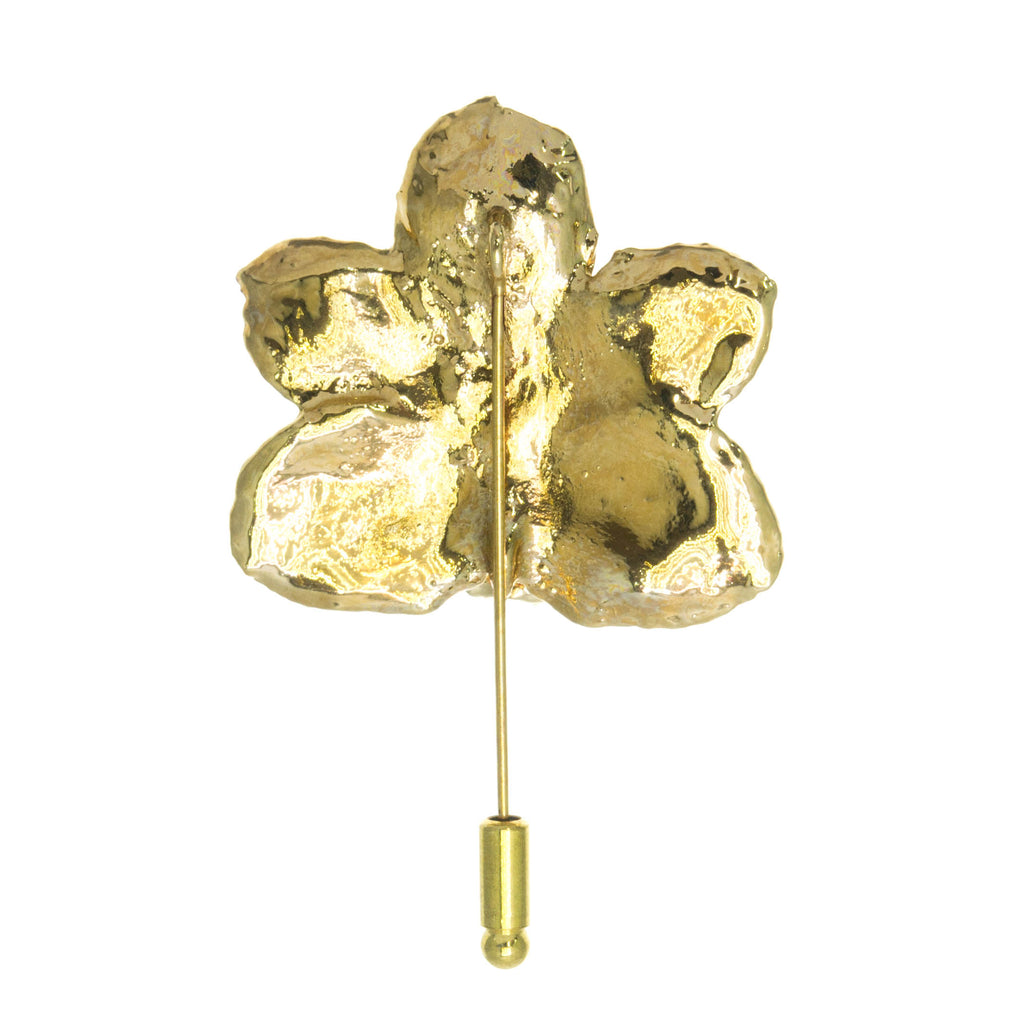 Designer's Notes: Orchid front coated in lacquer, back plated in 24k gold, 24k gold trim. Brooch is approx 5cm wide and 6.5cm long. Pin: gold plated. All our jewellery is nickel-free.