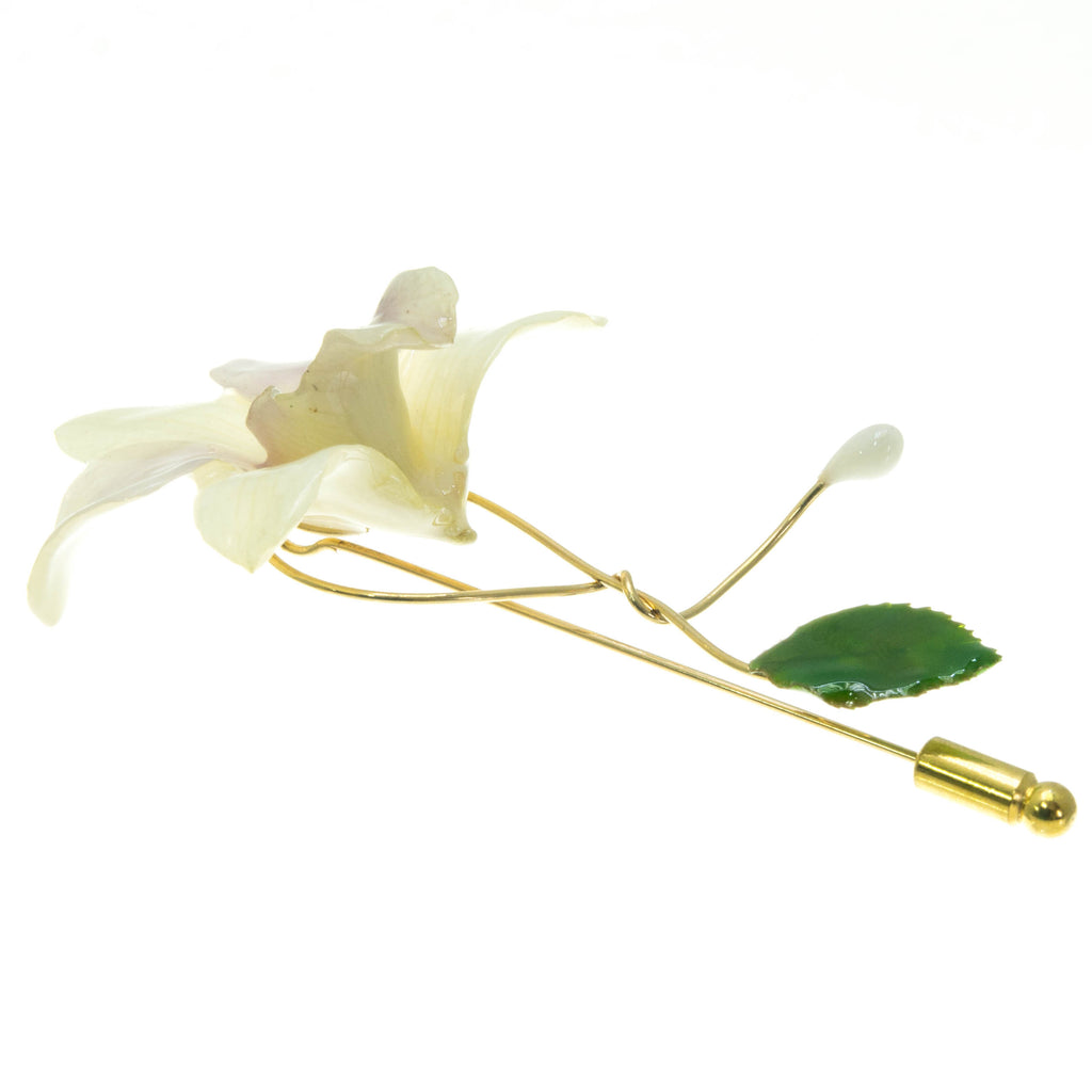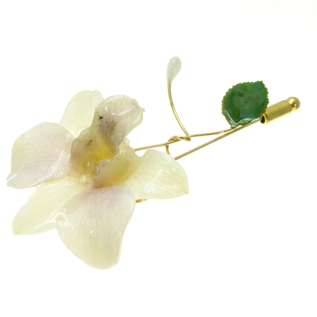 Dendrobium Orchid and Rose Leaf Stickpin Brooch - White